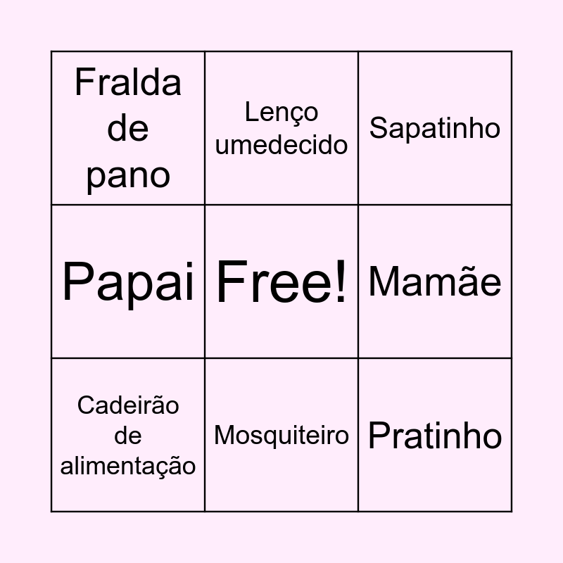 This bingo card has a free space and 108 words: Aqui está uma lista com 100 itens para o bingo do Chá da Helena! 🎀👶, Mamadeira, Fralda, Chupeta, Carrinho, Babador, Banheira, Body, Meia, Manta, Babá eletrônica, Berço, Cadeirinha, Almofada de amamentação, Escova de cabelo, Shampoo, Lenço umedecido, Mordedor, Naninha, Termômetro, Prendedor de chupeta, Travesseiro, Pomada, Toalha com capuz, Aspirador nasal, Pratinho, Mamãe, Papai, Chá de bebê, Ursinho de pelúcia, Fita adesiva, Kit higiene, Cueiro, Paninho de boca, Macacão, Sapatinho, Touca, Luvinhas, Canguru, Cobertor, Colher de silicone, Prato térmico, Copo de treinamento, Tapete de atividades, Móbile, Cadeirão de alimentação, Protetor de berço, Mosquiteiro, Bomba de tirar leite, Sling, Mamadeira térmica, Cortador de unha, Escova de mamadeira, Termômetro de banho, Travesseiro antirrefluxo, Capa para carrinho, Capa para bebê conforto, Lençol de berço, Lençol de carrinho, Fralda de pano, Fralda descartável, Cotonete, Sabonete líquido, Hidratante infantil, Talco, Protetor solar infantil, Repelente infantil, Pente, Cesto de roupas, Porta-fraldas, Tapetinho para troca, Lixeira com pedal, Porta leite em pó, Copo com canudo, Brinquedos de banho, Cadeirinha de balanço, Mochila maternidade, Kit de escovação, Chocalho, Livro de pano, Kit berço, Protetor de tomada, Grade de segurança, Protetor solar para carro, Protetor de quina, Trava de gaveta, Banquinho infantil, Espelho para carro, Babá eletrônica com câmera, Piscina de bolinhas, Tapete emborrachado, Óculos de sol infantil, Mordedor com água, Colônia infantil, Bolsa térmica, Mamadeira antivazamento, Kit alimentação, Chupeta ortodôntica, Porta chupeta, Gel dental infantil, Manta de algodão, Cadeira de descanso, Porta documentos do bebê, Kit primeiros cuidados, Copo antivazamento, Porta lanchinhos, Troninho and Babador impermeável.