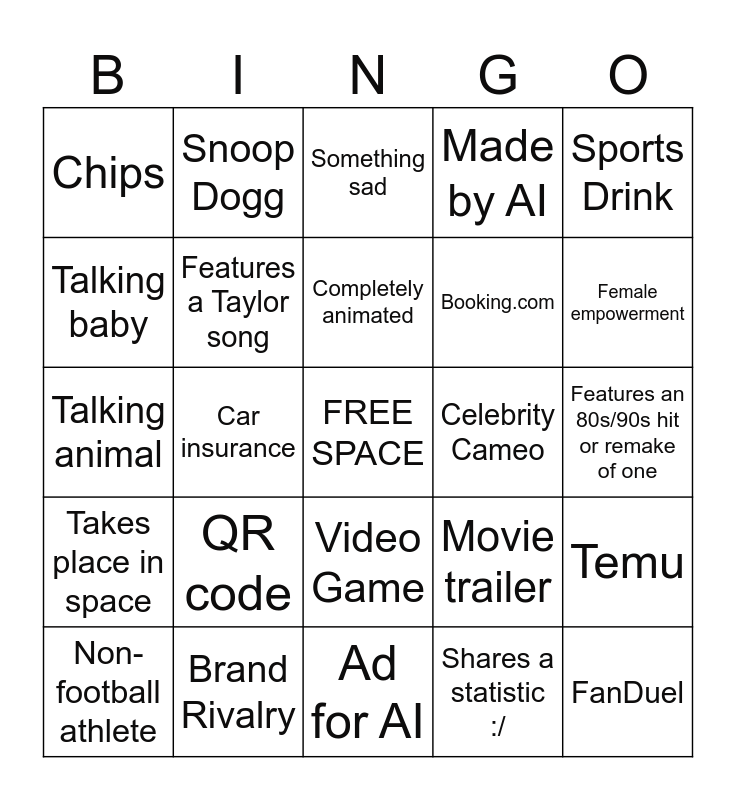 This bingo card has a free space and 27 words: Movie trailer, Beer, Booking.com, Ad for AI, Talking baby, Something sad, Snoop Dogg, Takes place in space, Celebrity Cameo, Temu, Talking animal, Made by AI, Non-football athlete, Brand Rivalry, Female empowerment, Political, Features a Taylor song, Completely animated, QR code, Chips, Features an 80s/90s hit or remake of one, Shares a statistic :/, Car insurance, FanDuel, Video Game, Sports Drink and Horse.