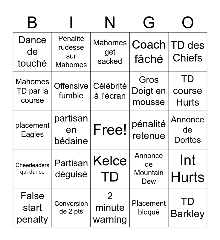 This bingo card has a free space and 28 words: Int Hurts, Placement raté, Gros Doigt en mousse, Placement bloqué, Mahomes TD par la course, Mahomes get sacked, Pénalité rudesse sur Mahomes, Cheerleaders qui dance, pénalité retenue, False start penalty, placement Eagles, Coach fâché, Conversion de 2 pts, 2 minute warning, TD course Hurts, TD sur retour de botté, Partisan déguisé, Offensive fumble, Célébrité à l'écran, Kelce TD, Dance de touché, Coach chalenge, TD Barkley, partisan en bédaine, Annonce de Doritos, Annonce de Mountain Dew, TD des Chiefs and TD des Eagles.
