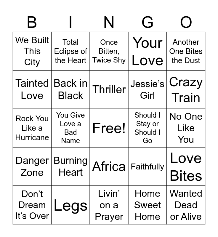 This bingo card has a free space and 60 words: When I See You Smile, Legs, Send Me an Angel, Danger Zone, Home Sweet Home, The Stroke, Back in Black, Edge of Seventeen, Jessie’s Girl, Jump, Your Love, Heat of the Moment, Tainted Love, The Boys Are Back in Town, Panama, We Built This City, Wanted Dead or Alive, Another One Bites the Dust, Don’t Stop Believin’, Thriller, Should I Stay or Should I Go, Once Bitten, Twice Shy, Don’t Dream It’s Over, Love Bites, Somebody’s Watching Me, Keep on Loving You, Runaway, Eye of the Tiger, Crazy Train, The Final Countdown, What I Like About You, Working for the Weekend, Talk Dirty to Me, She’s in Love with the Boy, Total Eclipse of the Heart, Every Breath You Take, Maneater, You Give Love a Bad Name, The Warrior, Rock You Like a Hurricane, Heartbreaker, Burning Heart, No One Like You, Burning Down the House, Faithfully, Come on Eileen, Harden My Heart, Sweet Child o’ Mine, Love Is a Battlefield, Africa, Livin’ on a Prayer, We’re Not Gonna Take It, Don’t You (Forget About Me), Owner of a Lonely Heart, Kickstart My Heart, I Love Rock ‘n’ Roll, Here I Go Again, Pour Some Sugar on Me, Take On Me and Summer of ‘69.