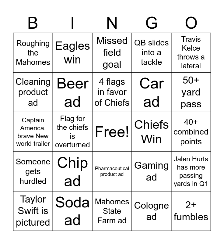 This bingo card has a free space and 24 words: Chip ad, Soda ad, 4 flags in favor of Chiefs, Taylor Swift is pictured, Travis Kelce throws a lateral, Roughing the Mahomes, Cleaning product ad, Eagles win, Chiefs Win, Pharmaceutical product ad, Car ad, Captain America, brave New world trailer, Gaming ad, Jalen Hurts has more passing yards in Q1, Beer ad, Cologne ad, 40+ combined points, Missed field goal, 50+ yard pass, Flag for the chiefs is overturned, 2+ fumbles, Someone gets hurdled, QB slides into a tackle and Mahomes State Farm ad.