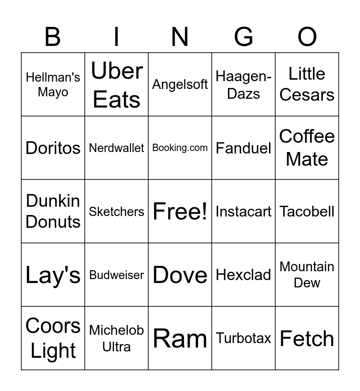 This bingo card has a free space and 24 words: Budweiser, Michelob Ultra, Booking.com, Coors Light, Little Cesars, Hellman's Mayo, Doritos, Uber Eats, Instacart, Dove, Fanduel, Dunkin Donuts, Hexclad, Mountain Dew, Nerdwallet, Turbotax, Tacobell, Angelsoft, Coffee Mate, Sketchers, Fetch, Lay's, Haagen-Dazs and Ram.