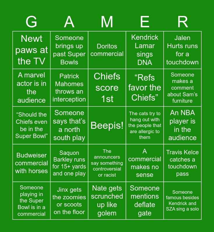 This bingo card has a free space and 38 words: Taylor Swift is on screen in the first 10 minutes, Kendrick Lamar and Taylor Swift perform together, Holly talks about Taylor Swift, Patrick Mahomes throws an interception, Travis Kelce catches a touchdown pass, Saquon Barkley runs for 15+ yards and one play, Chiefs score 1st, Eagles score 1st, Jalen Hurts runs for a touchdown, “Refs favor the Chiefs”, Someone says that’s a north south play, Kendrick Lamar sings DNA, Someone famous besides Kendrick and SZA sing a solo, An NBA player is in the audience, A marvel actor is in the audience, Budweiser commercial with horses, State Farm commercial, Doritos commercial, The Pringles commercial announcement is dumb, The cats try to hang out with the people that are allergic to them, Newt paws at the TV, Jinx gets the zoomies or scoots on the floor, Someone makes a comment about Sam’s furniture, Someone playing in the Super Bowl is in a commercial, Tom Brady mentions his past Super Bowl wins, Nate gets scrunched up like golem, Someone asks Cayla how work is and she gives a crazy story/Update, Charlotte gets someone to take a shot, “Hidden nut” in Jacob’s food, The boys talk about work, Trump does something stupid, The announcers say something controversial or racist, Someone mentions deflate gate, Someone brings up past Super Bowls, Josh keeps petting a cat or keeping them on his lap when he shouldn’t, A commercial makes no sense, “Should the Chiefs even be in the Super Bowl” and Taylor Swift is on screen in the first 10 minutes.