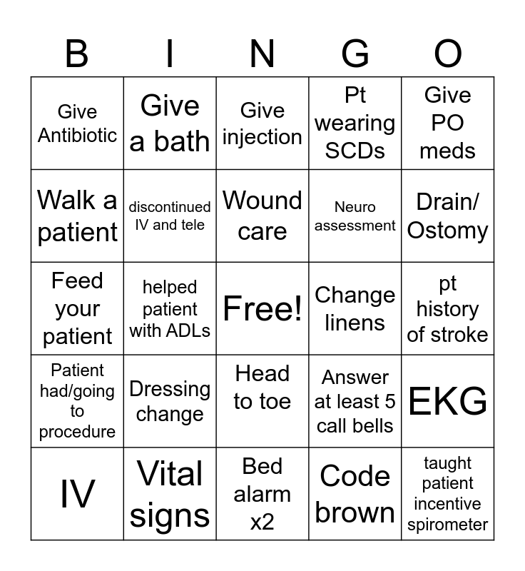 This bingo card has a free space and 24 words: Dressing change, Vital signs, Wound care, IV, Give PO meds, Give Antibiotic, Walk a patient, Give a bath, Change linens, Head to toe, Neuro assessment, Feed your patient, Answer at least 5 call bells, EKG, discontinued IV and tele, Code brown, pt history of stroke, Give injection, Drain/ Ostomy, helped patient with ADLs, taught patient incentive spirometer, Patient had/going to procedure, Pt wearing SCDs and Bed alarm x2.