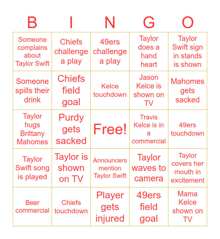 This bingo card has a free space and 24 words: Taylor is shown on TV, Chiefs touchdown, Kelce touchdown, Beer commercial, Taylor Swift sign in stands is shown, Someone complains about Taylor Swift, Someone spills their drink, Chiefs challenge a play, Travis Kelce is in a commercial, Announcers mention Taylor Swift, Jason Kelce is shown on TV, Taylor hugs Brittany Mahomes, Taylor waves to camera, Taylor covers her mouth in excitement, Chiefs field goal, 49ers field goal, 49ers touchdown, 49ers challenge a play, Mahomes gets sacked, Purdy gets sacked, Mama Kelce shown on TV, Taylor Swift song is played, Taylor does a hand heart and Player gets injured.