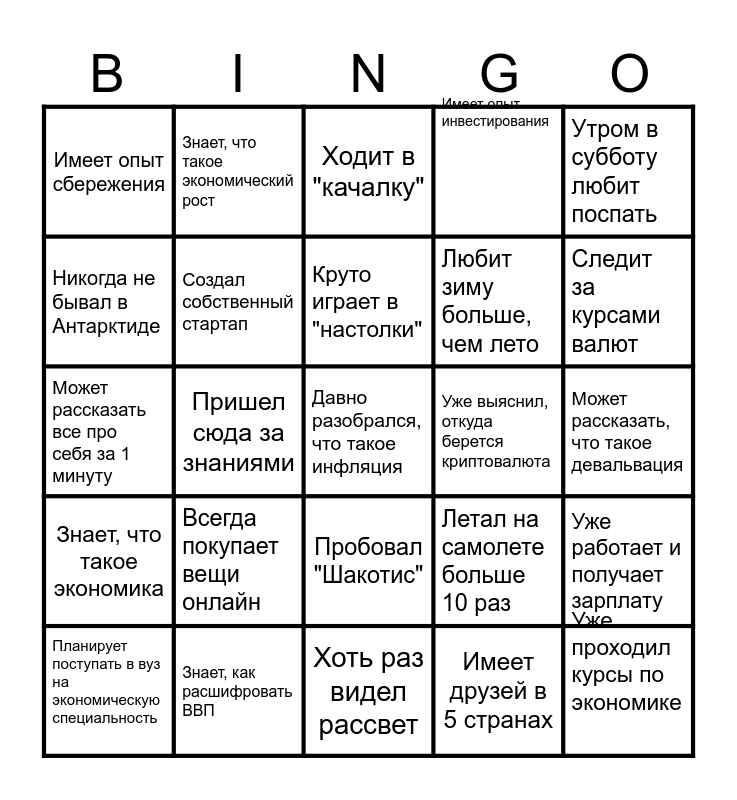 This bingo card has a free space and 24 words: Всегда покупает вещи онлайн, Знает, как расшифровать ВВП, Круто играет в "настолки", Планирует поступать в вуз на экономическую специальность, Утром в субботу любит поспать, Имеет опыт сбережения, Никогда не бывал в Антарктиде, Знает, что такое экономический рост, Уже выяснил, откуда берется криптовалюта, Пробовал "Шакотис", Любит зиму больше, чем лето, Может рассказать все про себя за 1 минуту, Летал на самолете больше 10 раз, Уже работает и получает зарплату, Создал собственный стартап, Имеет друзей в 5 странах, Может рассказать, что такое девальвация, Ходит в "качалку", Следит за курсами валют, Пришел сюда за знаниями, Уже проходил курсы по экономике, Знает, что такое экономика, Имеет опыт инвестирования and Хоть раз видел рассвет.