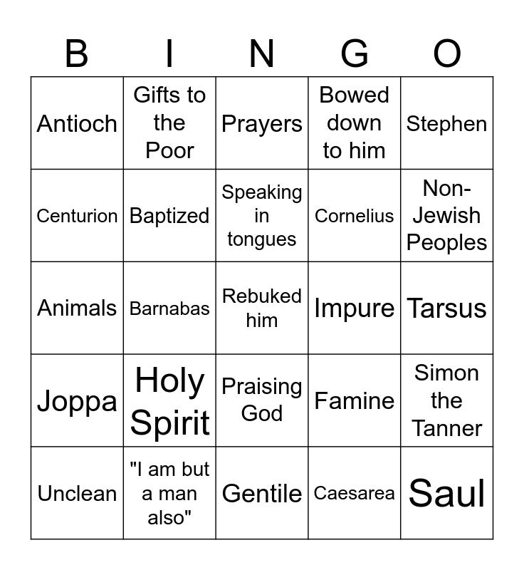 This bingo card has a free space and 28 words: Simon the Tanner, Simon Peter, Cornelius, Caesarea, Centurion, Prayers, Gifts to the Poor, Joppa, Impure, Unclean, Animals, Bowed down to him, "I am but a man also", Gentile, Non-Jewish Peoples, Jesus of Nazareth, Holy Spirit, Baptized, Speaking in tongues, Praising God, Antioch, Christians, Saul, Barnabas, Tarsus, Famine, Stephen and Send help to brothers in Judea.