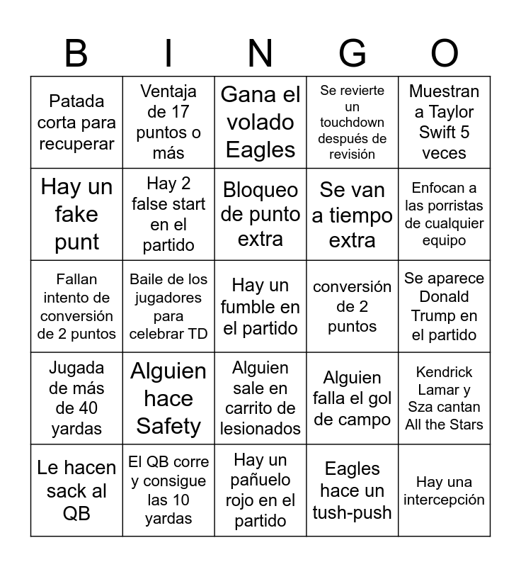 This bingo card has 25 words: Alguien hace Safety, Hay un pañuelo rojo en el partido, Bloqueo de punto extra, Le hacen sack al QB, Muestran a Taylor Swift 5 veces, Patada corta para recuperar, Hay un fake punt, Ventaja de 17 puntos o más, conversión de 2 puntos, Alguien sale en carrito de lesionados, Se van a tiempo extra, Fallan intento de conversión de 2 puntos, Alguien falla el gol de campo, Kendrick Lamar y Sza cantan All the Stars, Hay 2 false start en el partido, Hay una intercepción, Se aparece Donald Trump en el partido, Gana el volado Eagles, Enfocan a las porristas de cualquier equipo, Baile de los jugadores para celebrar TD, Hay un fumble en el partido, El QB corre y consigue las 10 yardas, Jugada de más de 40 yardas, Se revierte un touchdown después de revisión and Eagles hace un tush-push.