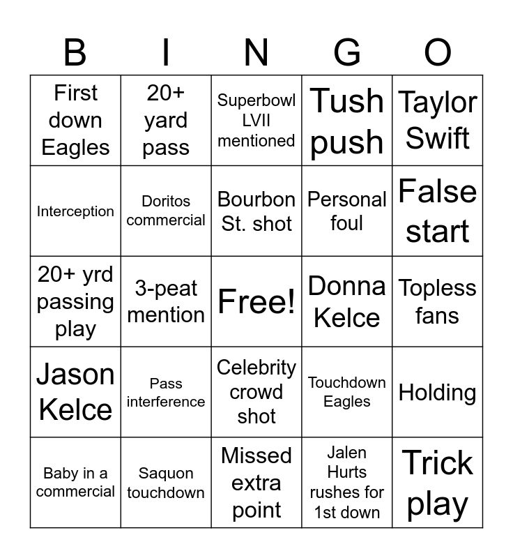 This bingo card has a free space and 39 words: Eagles touchdown, AJ Brown touchdown, Saquon Barkley 20+ yd run, Doritos commercial, Baby in a commercial, Celebrity crowd shot, Bourbon St. shot, Disappointed fans, Taylor Swift, Jason Kelce, 3-peat mention, Tush push, Trick play, Topless fans, Donna Kelce, Pass interference, Reversed call, First down Eagles, Touchdown Chiefs, Touchdown Eagles, Interception, Missed extra point, Personal foul, False start, Attempted 2 pt conversion, Touchdown dance, Field goal, Missed field goal, Fumble, 20+ yard pass, Soda commercial, Movie trailer, Superbowl LVII mentioned, Saquon touchdown, Jalen Hurts rushes for 1st down, Mahomes roughing the passer call, Holding, 20+ yrd passing play and Religious commercial.