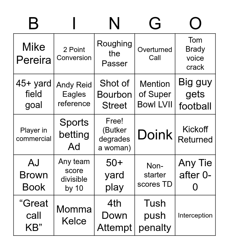 This bingo card has a free space and 29 words: “Great call KB”, Tush push, Sports betting Ad, Non- QB Pass, Mike Pereira, Roughing the Passer, Andy Reid Eagles reference, Any team score divisible by 10, Doink, Momma Kelce, Kickoff Returned, Interception, 4th Down Attempt, Tush push penalty, Big guy gets football, Sack, 50+ yard play, AJ Brown Book, Tom Brady voice crack, Player in commercial, Non-starter scores TD, Saquon’s birthday reference, Mention of Super Bowl LVII, 45+ yard field goal, Overturned Call, 2 Point Conversion, Any Tie after 0-0, Shot of Bourbon Street and -10 Yard Play.