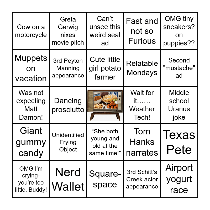 This bingo card has a free space and 24 words: Unidentified Frying Object, Nerd Wallet, Cute little girl potato farmer, OMG I'm crying- you're too little, Buddy!, OMG tiny sneakers? on puppies??, Cow on a motorcycle, Muppets on vacation, Greta Gerwig nixes movie pitch, Wait for it…… Weather Tech!, “She both young and old at the same time!”, Relatable Mondays, Was not expecting Matt Damon!, Tom Hanks narrates, Texas Pete, 3rd Peyton Manning appearance, 3rd Schitt’s Creek actor appearance, Middle school Uranus joke, Can’t unsee this weird seal ad, Second "mustache" ad, Dancing prosciutto, Airport yogurt race, Giant gummy candy, Fast and not so Furious and Square-space.
