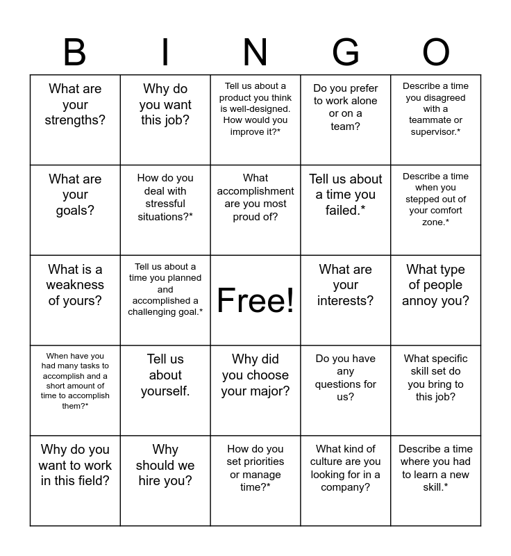 This bingo card has a free space and 24 words: Tell us about yourself., Why should we hire you?, What accomplishment are you most proud of?, Why do you want to work in this field?, Describe a time you disagreed with a teammate or supervisor.*, What are your strengths?, What are your goals?, Why do you want this job?, What are your interests?, Why did you choose your major?, Tell us about a time you failed.*, What is a weakness of yours?, Do you have any questions for us?, What specific skill set do you bring to this job?, How do you deal with stressful situations?*, What kind of culture are you looking for in a company?, What type of people annoy you?, Tell us about a product you think is well-designed. How would you improve it?*, Describe a time when you stepped out of your comfort zone.*, Tell us about a time you planned and accomplished a challenging goal.*, Describe a time where you had to learn a new skill.*, When have you had many tasks to accomplish and a short amount of time to accomplish them?*, Do you prefer to work alone or on a team? and How do you set priorities or manage time?*.