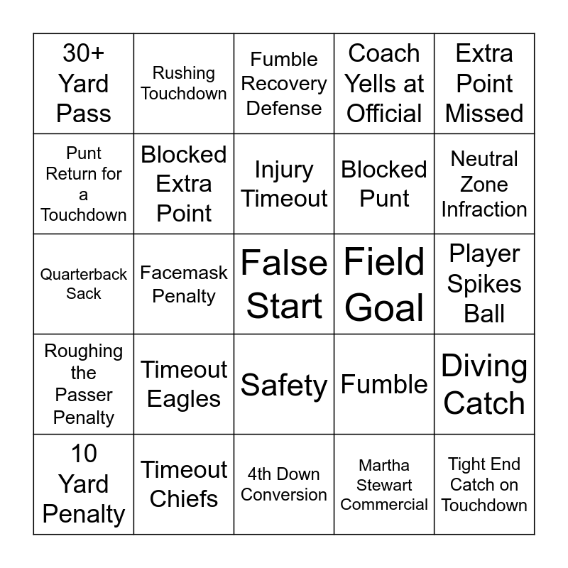 This bingo card has 57 words: Free!, 10 Yard Penalty, 2 Point Conversion, 30+ Yard Pass, 4th Down Conversion, Block In the Back Penalty, Blocked Extra Point, Blocked Field Goal, Blocked Punt, Booth Review, Coach Yells at Official, Coach’s Challenge, Defensive Holding Call, Defensive Pass Interference, Delay of Game Penalty, Extra Point, Extra Point Missed, Facemask Penalty, Fair Catch Signal, False Start, Field Goal, Field Goal Missed, Fumble, Fumble Recovery Defense, Injured Player Leaves Field, Injury Timeout, Intentional Grounding, Interception For Touchdown, Neutral Zone Infraction, Offensive Holding Call, Offensive Pass Interference, Onside Kick, Passing Touchdown, Personal Foul Penalty, Player Spikes Ball, Punt Return for a Touchdown, Quarterback Takes a Knee, Quarterback Sack, Roughing the Kicker Penalty, Roughing the Passer Penalty, Rushing Touchdown, Safety, Tight End Catch on Touchdown, Too Many Men on Field Call, Turnover on Downs, Tied Score, Timeout Eagles, Timeout Chiefs, Reversed Call, Drew Barrymore Commercial, Matthew McConaughey Commercial, Martha Stewart Commercial, Meg Ryan, Billy Crystal Commercial, One-handed Catch, Missed Kick, Diving Catch and Touchdown Dance.