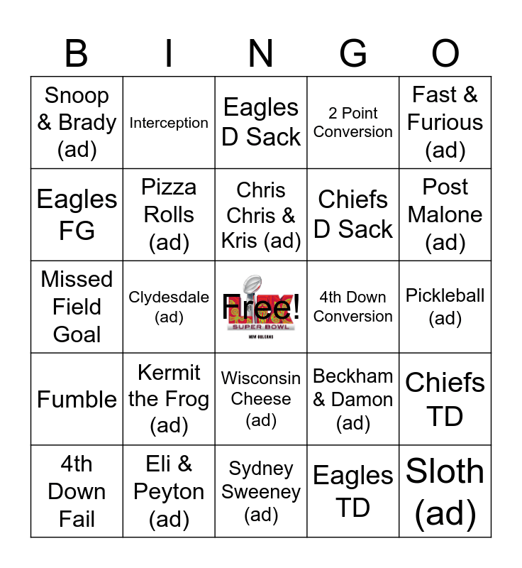 This bingo card has a free space and 28 words: Chiefs TD, Chiefs FG, Chiefs D Sack, Eagles TD, Eagles FG, Eagles D Sack, Interception, Fumble, 4th Down Conversion, 4th Down Fail, Missed Field Goal, 2 Point Conversion, Eli & Peyton (ad), Sydney Sweeney (ad), Post Malone (ad), Flying Mustache (ad), Kermit the Frog (ad), Pizza Rolls (ad), Chris Chris & Kris (ad), Wisconsin Cheese (ad), Snoop & Brady (ad), Kool-Aid Man (ad), Sloth (ad), Clydesdale (ad), Pickleball (ad), Beckham & Damon (ad), Fast & Furious (ad) and Pete Davidson (ad).