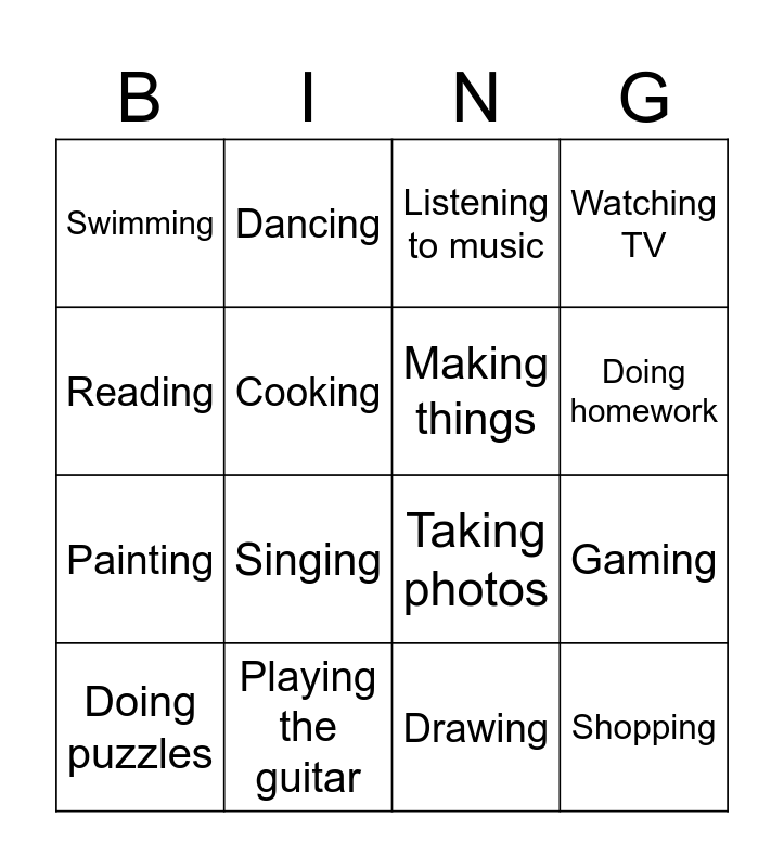 This bingo card has 16 words: Playing the guitar, Gaming, Listening to music, Swimming, Painting, Dancing, Taking photos, Drawing, Reading, Cooking, Doing puzzles, Watching TV, Singing, Doing homework, Making things and Shopping.