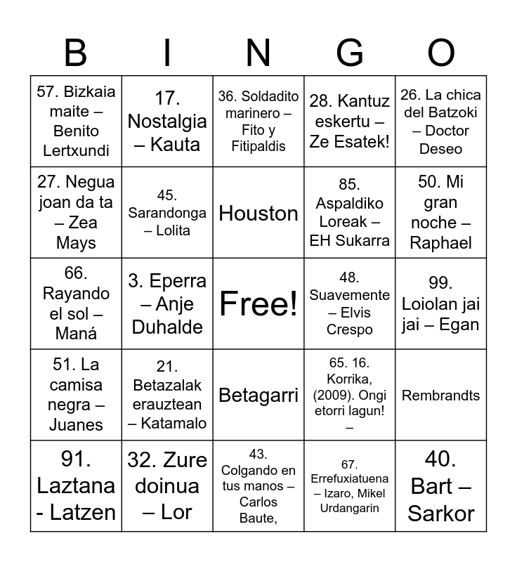 This bingo card has a free space and 108 words: 1. Hegal egiten - Itoiz, 2. 1, 2, 3, 4, Ispiluen aurrean – Akelarre, 3. Eperra – Anje Duhalde, 4. Hay que venir al sur – Raffaella Carrà, 5. Vivir así es morir de amor – Camilo Sesto, 6. Chica Yeye – Concha Velasco, 7. Besos – El Canto del Loco, 8. Dancing Queen – ABBA, 9. Aitormena – Hertzainak, 10. Zoratzen naizela – Hertzainak, 11. Caballo Prieto Azabache – Puro Relajo, 12. La Adelita – Puro Relajo, 13. Urepel – Gatibu, 14. Ilargia – Ken Zazpi, 15. Aurkitu zintudan – Exkixu, 16. Otra noche – Kaotiko, 17. Nostalgia – Kauta, 18. Ikusi arte – Berri Txarrak, 19. Guregatik – Hesian, 20. Itxaropena – Su Ta Gar, 21. Betazalak erauztean – Katamalo, 22. Burua hotz eta bihotza bero – Des-Kontrol, 23. Besos de Kubata – Txapelpunk, 24. Amets – Gari, 25. Corazón de Tango – Doctor Deseo, 26. La chica del Batzoki – Doctor Deseo, 27. Negua joan da ta – Zea Mays, 28. Kantuz eskertu – Ze Esatek!, 29. Orain – Hemendik At, 30. Txanpon baten truke – Alaitz eta Maider, 31. Gure Kaiola – Glaukoma, 32. Zure doinua – Lor, 33. Kalanbreak – Gozategi, 34. Ez gaitu inork geldituko – Urtz, 35. Kolore Gabeko – Urgabe, 36. Soldadito marinero – Fito y Fitipaldis, 37. Kaliek hutsik – Txoriburu Produkzions, 38. Zaindu maite duzun hori – Ruper Ordorika, 39. Rosas – La Oreja de Van Gogh, 40. Bart – Sarkor, 41. Espero dudan pertsona bakarra – Leihotikan, 42. Y yo sigo aquí – Paulina Rubio, 43. Colgando en tus manos – Carlos Baute,, Marta Sánchez, 44. El Rey – Vicente Fernández, 45. Sarandonga – Lolita, 46. I wanna dance with somebody – Whitney, Houston, 47. Don´t stop me now – Queen, 48. Suavemente – Elvis Crespo, 49. A quién le importa – Alaska y Dinamara, 50. Mi gran noche – Raphael, 51. La camisa negra – Juanes, 52. Kantu bat – Bulego, 53. Maite zaitut - Pirritx, Porrotx eta Marimotots, 54. Baloreak – Baloreak, 55. Tabernako argiak – Mconak, 56. Eskola Txikiak – Pirritx, Porrotx eta, Marimotots, 57. Bizkaia maite – Benito Lertxundi, 58. Ai ze polita – Jokaldi, 59. Welcome of Beach – Gozategi, 60. Maitatzen zaitudalako – Tapia eta Leturia, 61. Horrelako – The Uski´s, 62. Astronauta Tronpeta Flauta – Ene Kantak,, Brigi Duke, 63. I´ll be there for you (Friends) – The, Rembrandts, 64. Hips Don´t Lie – Shakira, 65. 16. Korrika, (2009). Ongi etorri lagun! –, Betagarri, 66. Rayando el sol – Maná, 67. Errefuxiatuena – Izaro, Mikel Urdangarin, 68. Bexamela ta pastela – Maixa Ta Ixiar, 69. Gogoak – Esne Beltza, 70. Zurekin Batera – En Tol Sarmiento, 71. Itzulera – Zetak, Erramun Martikorena, 72. Udarako Gau Luzeak – Vendetta, 73. Despechá – Rosalía, 74. Eskutitza – Hemendik At, 75. Arratsalde honetan – Sorotan Bele, 76. Eskuetan – Pirritx, Porrotx eta Marimotots, 77. Zarena Zarelako – Sugan, 78. Euskal Herrian Euskaraz – Oskorri, 79. Bagare – Gontzal Mendibil eta Xeberri, 80. Material Girl – 2024 Remaster – Madonna, 81. Sweet Caroline – Neil Diamond, 82. Take me home, country roads – John, Denver, 83. Serenade – Dover, 84. Euskararen Txantxangorria – Go!azen, 85. Aspaldiko Loreak – EH Sukarra, 86. Déjame – Los Secretos, 87. Teoria bat – Gorka Urbizu, 88. Gu geu garena – El Tol Sarmiento, Süne, 89. Aioiai – Neomak, 90. Iluntzean – Maixa eta Ixiar, Iker eta Larraitz, 91. Laztana - Latzen, 92. Glastonbury - Nogen, 93. Ni tú ni nadie – Alaska y Dinarama, 94. Mamma mia – ABBA, 95. Un beso y una flor – Nino Bravo, 96. Lepoan hartu ta segi aurrera – Pantxoa eta, Peio, 97. Rimmel – Gose, 98. You´re the one that I want – Grease, 99. Loiolan jai jai – Egan and 100. Itsasontzi baten - Kaxiano.