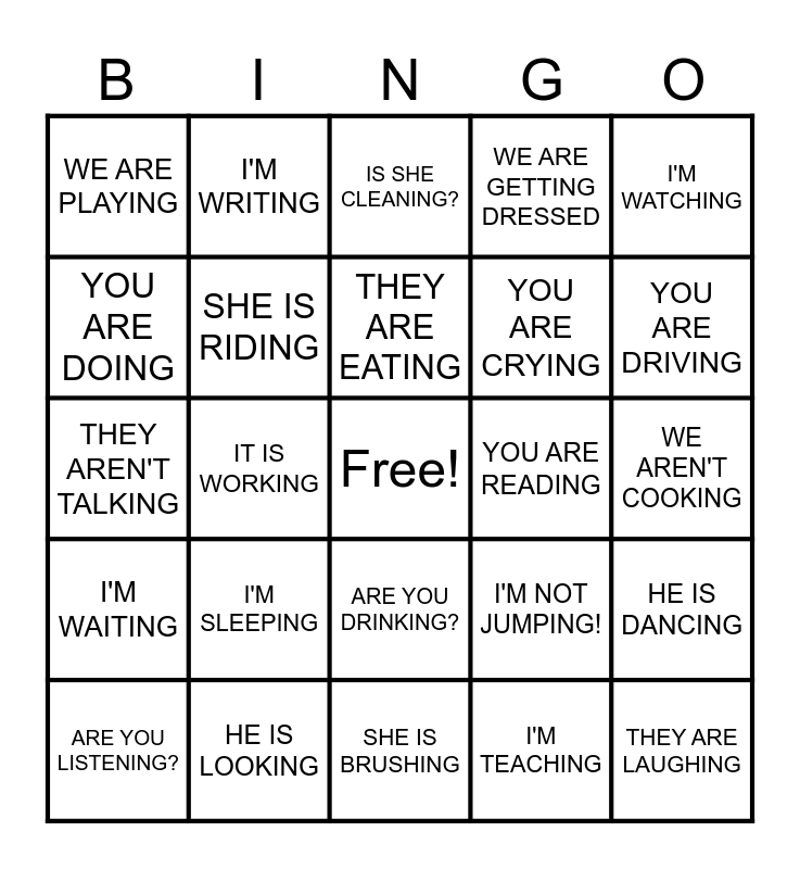 This bingo card has a free space and 24 words: I'M SLEEPING, HE IS LOOKING, THEY ARE EATING, ARE YOU LISTENING?, I'M WATCHING, WE ARE PLAYING, YOU ARE DOING, I'M WRITING, YOU ARE READING, ARE YOU DRINKING?, YOU ARE CRYING, THEY AREN'T TALKING, I'M NOT JUMPING!, HE IS DANCING, SHE IS RIDING, I'M TEACHING, WE AREN'T COOKING, IS SHE CLEANING?, YOU ARE DRIVING, IT IS WORKING, THEY ARE LAUGHING, I'M WAITING, WE ARE GETTING DRESSED and SHE IS BRUSHING.