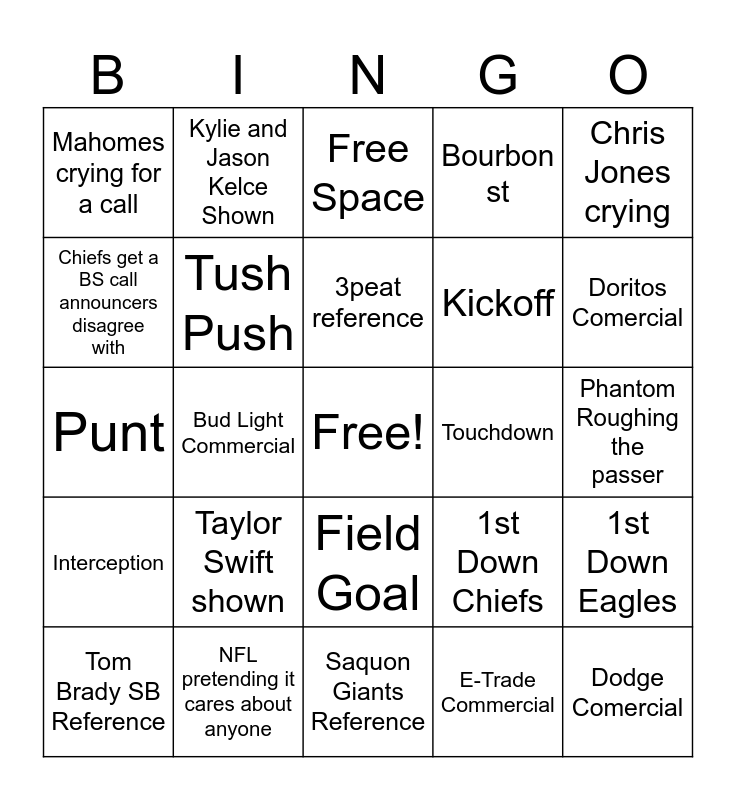 This bingo card has a free space and 25 words: Taylor Swift shown, Saquon Giants Reference, 3peat reference, Tom Brady SB Reference, Chris Jones crying, Mahomes crying for a call, Chiefs get a BS call announcers disagree with, Kylie and Jason Kelce Shown, Touchdown, Field Goal, Kickoff, Punt, 1st Down Chiefs, 1st Down Eagles, Tush Push, Buffalo Bills Reference, Phantom Roughing the passer, Free Space, Doritos Comercial, Bud Light Commercial, Dodge Comercial, NFL pretending it cares about anyone, Interception, Bourbon st and E-Trade Commercial.