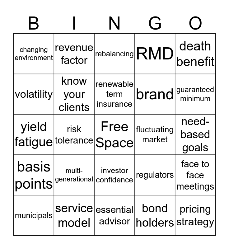 This bingo card has a free space and 24 words: multi-generational, service model, renewable term insurance, municipals, death benefit, changing environment, volatility, revenue factor, fluctuating market, investor confidence, brand, yield fatigue, regulators, face to face meetings, know your clients, bond holders, need-based goals, rebalancing, guaranteed minimum, risk tolerance, pricing strategy, basis points, RMD and essential advisor.