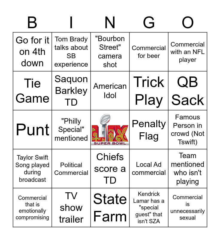 This bingo card has a free space and 44 words: Shows Trump in stands, Commercial is unnecessarily sexual, Shows Taylor In stands, Commercial that is emotionally compromising, Announcers say a double entendre, Kendrick Lamar has a "special guest" that isn't SZA, "Bourbon Street" camera shot, "Tush Push", Commercial with an NFL player, TV show trailer, Commercial for beer, Penalty Flag, Chiefs score a TD, Political Commercial, Eagles Score a TD, State Farm, "Play is Under Review", Punt, Gambling Commercial, QB Sack, Tom Brady talks about SB experience, Trophy Shot, Movie Trailer, Go for it on 4th down, Multi-Part Commercial, Famous Person in crowd (Not Tswift), Commercial for food, Commercial with an "Old Actor", Local Ad commercial, Taylor Swift Song played during broadcast, Detroit Lions mentioned, Team mentioned who isn't playing, Shirtless Fan, Jason Kelce, "Philly Special" mentioned, Abbot Elementary mentioned, Fumble, Pic of Andy Reed when he coached the Eagles, American Idol, Tie Game, Trick Play, Travis Kelce TD, Saquon Barkley TD and A.I. Commercial.