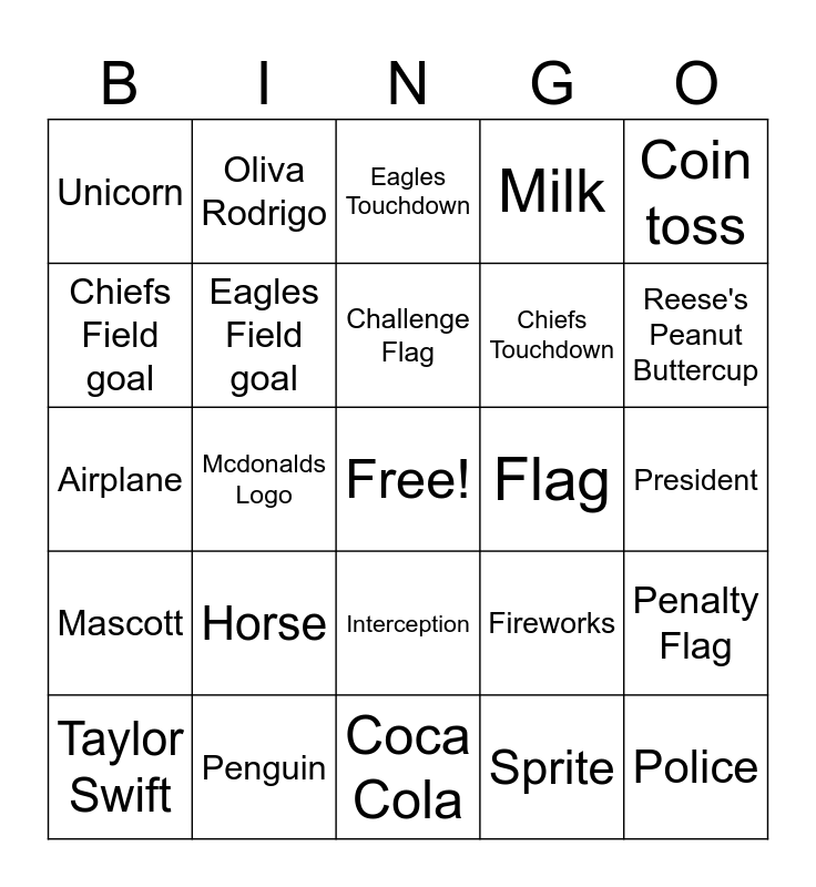 This bingo card has a free space and 29 words: Taylor Swift, M&M, Mcdonalds Logo, Mario Bros, Unicorn, Eagles Touchdown, Eagles Field goal, Horse, Flag, Penguin, President, Police, Coca Cola, Sprite, Reese's Peanut Buttercup, Travis Kelce Catches Ball, Interception, Mascott, Coin toss, Airplane, Fireworks, Fumble, Chiefs Touchdown, Chiefs Field goal, Milk, Oliva Rodrigo, Penalty Flag, Challenge Flag and QB Sack.