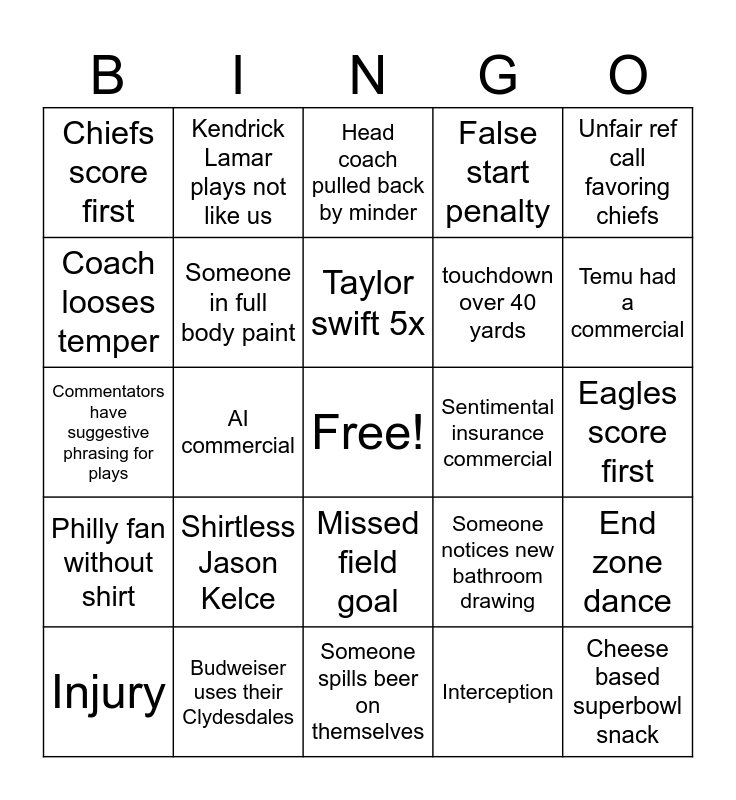 This bingo card has a free space and 33 words: One score game, Military commercial, AI commercial, Abortion commercial, Philly fan without shirt, Someone in full body paint, Unfair ref call favoring chiefs, Injury, Kendrick Lamar plays not like us, Surprise guest singer, Taylor swift 5x, Head coach pulled back by minder, “tush push” m, Mahomes’ new baby, Sentimental insurance commercial, Temu had a commercial, Budweiser uses their Clydesdales, Commentators have suggestive phrasing for plays, Shirtless Jason Kelce, Someone notices new bathroom drawing, Missed field goal, Suggestive commentator comment, Chiefs score first, Eagles score first, Someone spills beer on themselves, Cheese based superbowl snack, False start penalty, touchdown over 40 yards, Coach looses temper, End zone dance, Game tied up after 0-0, Interception and Dunkin commercial with Sabrina Carpenter.
