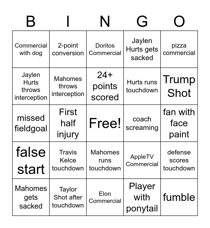 This bingo card has a free space and 24 words: Travis Kelce touchdown, Taylor Shot after touchdown, 24+ points scored, Mahomes gets sacked, pizza commercial, Commercial with dog, Jaylen Hurts throws interception, 2-point conversion, coach screaming, Mahomes runs touchdown, Hurts runs touchdown, missed fieldgoal, AppleTV Commercial, defense scores touchdown, Mahomes throws interception, Player with ponytail, fan with face paint, Doritos Commercial, Trump Shot, First half injury, fumble, false start, Jaylen Hurts gets sacked and Elon Commercial.