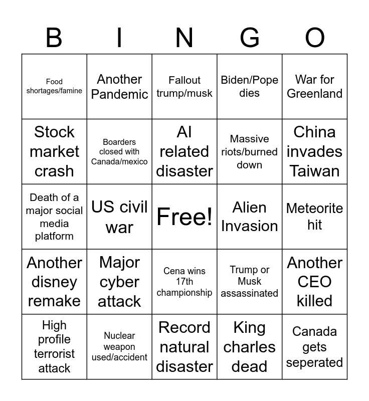 This bingo card has a free space and 24 words: Major cyber attack, Nuclear weapon used/accident, AI related disaster, High profile terrorist attack, War for Greenland, Food shortages/famine, Stock market crash, Another Pandemic, Alien Invasion, Cena wins 17th championship, Massive riots/burned down, Death of a major social media platform, Trump or Musk assassinated, Another CEO killed, Boarders closed with Canada/mexico, King charles dead, Meteorite hit, Fallout trump/musk, China invades Taiwan, US civil war, Canada gets seperated, Another disney remake, Biden/Pope dies and Record natural disaster.
