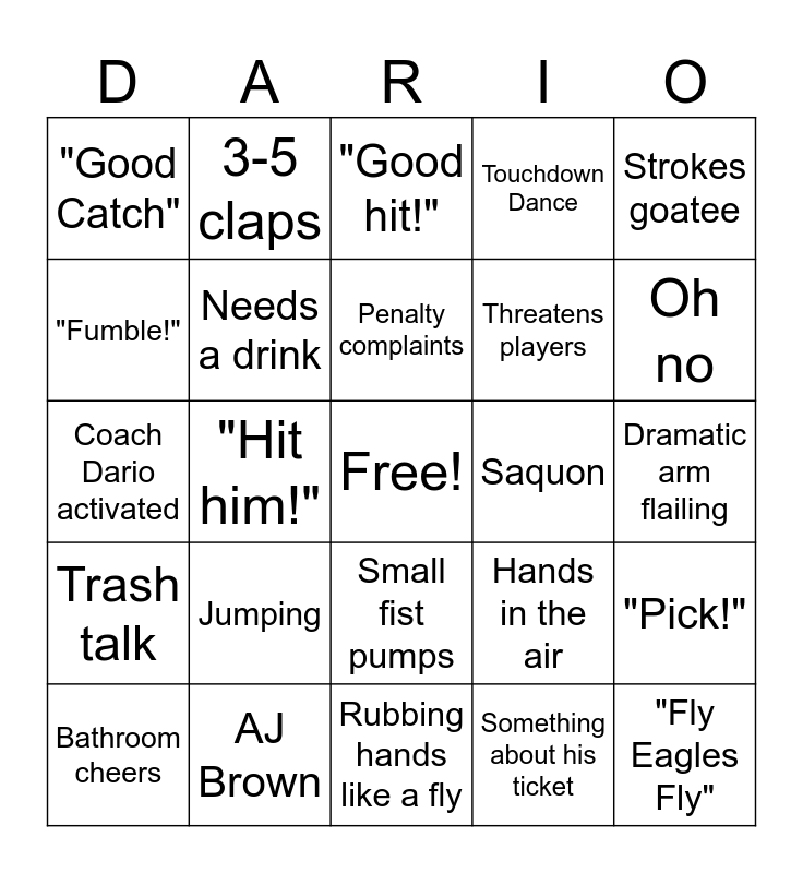 This bingo card has a free space and 24 words: Jumping, AJ Brown, Penalty complaints, Bathroom cheers, Strokes goatee, "Good Catch", "Fumble!", 3-5 claps, Saquon, Small fist pumps, Threatens players, Coach Dario activated, Hands in the air, "Pick!", Needs a drink, Something about his ticket, Dramatic arm flailing, "Good hit!", Oh no, "Hit him!", "Fly Eagles Fly", Trash talk, Touchdown Dance and Rubbing hands like a fly.