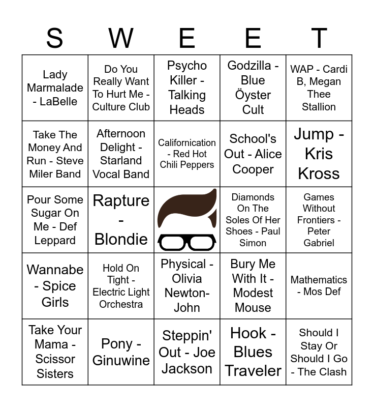 This bingo card has a free space and 40 words: Hotel Room Service - Pitbull, Pour Some Sugar On Me - Def Leppard, Stacy's Mom - Fountains Of Wayne, Afternoon Delight - Starland Vocal Band, Pony - Ginuwine, Physical - Olivia Newton-John, Californication - Red Hot Chili Peppers, Candy Shop - 50 Cent, Olivia, WAP - Cardi B, Megan Thee Stallion, Wannabe - Spice Girls, Rapture - Blondie, Godzilla - Blue Öyster Cult, Should I Stay Or Should I Go - The Clash, Games Without Frontiers - Peter Gabriel, Diamonds On The Soles Of Her Shoes - Paul Simon, Hold On Tight - Electric Light Orchestra, Michelle - The Beatles, Lady Marmalade - LaBelle, Stop! - Jane's Addiction, Psycho Killer - Talking Heads, Mathematics - Mos Def, Hook - Blues Traveler, School's Out - Alice Cooper, Take The Money And Run - Steve Miler Band, (This Song's Just) Six Words Long - "Weird Al" Yankovic, Werewolves of London - Warren Zevon, The Pretender - Jackson Browne, Yoga - Janelle Monáe, Jidenna, Lose Yourself - Eminem, Changes - 2Pac, Talent, That's Not My Name - The Ting Tings, Take Your Mama - Scissor Sisters, All For You - Janet Jackson, Bury Me With It - Modest Mouse, Jump - Kris Kross, Steppin' Out - Joe Jackson, I Will Survive - Gloria Gaynor, Times Like These - Foo Fighters, Do You Really Want To Hurt Me - Culture Club and Sabotage - Beastie Boys.