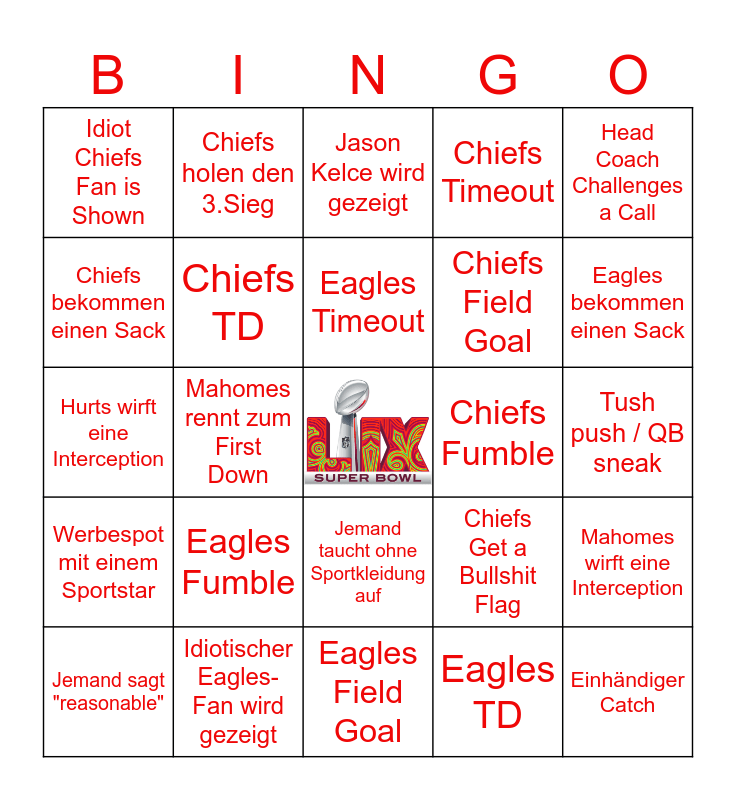 This bingo card has a free space and 28 words: Mahomes wirft eine Interception, Eagles bekommen eine Bullshit-Fahne, Chiefs Field Goal, Eagles TD, Chiefs bekommen einen Sack, Jason Kelce wird gezeigt, Chiefs holen den 3.Sieg, Werbespot mit einem Sportstar, Chiefs Fumble, Jemand sagt "reasonable", Hurts wirft eine Interception, Chiefs Timeout, Idiotischer Eagles-Fan wird gezeigt, Eagles Field Goal, Eagles bekommen einen Sack, Taylor Swift wird gezeigt, Eagles Fumble, Chiefs TD, Eagles Timeout, Jemand taucht ohne Sportkleidung auf, Idiot Chiefs Fan is Shown, Mama Kelce wird gezeigt, Einhändiger Catch, Mahomes rennt zum First Down, Tush push / QB sneak, Chiefs Get a Bullshit Flag, Head Coach Challenges a Call and Verfehltes Field-Goal.