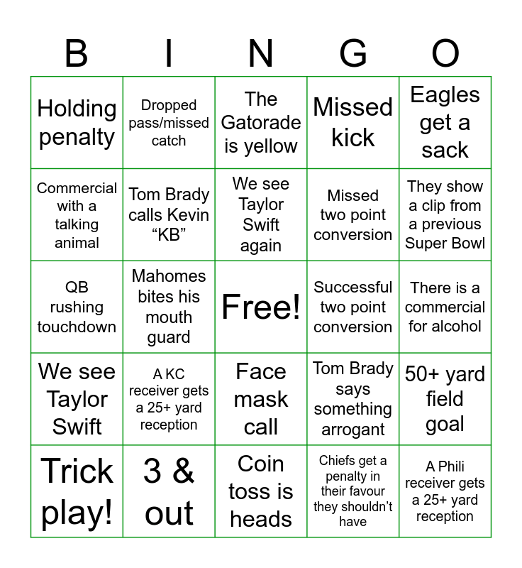 This bingo card has a free space and 36 words: Eagles go for it on fourth down, KC goes for it on fourth down, Mahomes fumble or interception, Tom Brady calls Kevin “KB”, Tom Brady says something arrogant, We see Taylor Swift, We see Taylor Swift again, We see Taylor Swift again, again (ok we get it now!!), Eagles get a sack, KC gets a sack, Mahomes bites his mouth guard, Missed kick, 40+ yard field goal, Successful two point conversion, They show a clip from a previous Super Bowl, Holding penalty, There is a run of over 20 yards, A KC receiver gets a 25+ yard reception, A Phili receiver gets a 25+ yard reception, The Gatorade is yellow, There is a commercial for alcohol, 50+ yard field goal, 3 & out, Trick play!, Coin toss is heads, Dropped pass/missed catch, QB rushing touchdown, Touchdown from outside the red zone, Missed two point conversion, Commercial with a talking animal, Eagles do the tush push, Eagles do the tush push again, Chiefs get a penalty in their favour they shouldn’t have, Face mask call, Roughing the passer call and There is a commercial for chips.