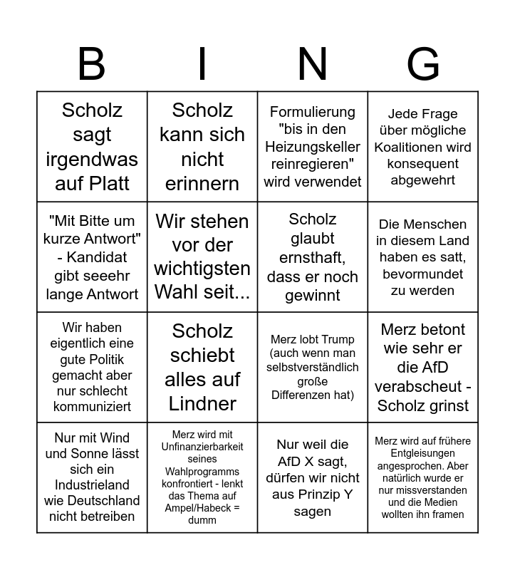 This bingo card has 16 words: Merz wird mit Unfinanzierbarkeit seines Wahlprogramms konfrontiert - lenkt das Thema auf Ampel/Habeck = dumm, Merz betont wie sehr er die AfD verabscheut - Scholz grinst, Formulierung "bis in den Heizungskeller reinregieren" wird verwendet, Scholz sagt irgendwas auf Platt, Wir haben eigentlich eine gute Politik gemacht aber nur schlecht kommuniziert, Scholz kann sich nicht erinnern, Merz lobt Trump (auch wenn man selbstverständlich große Differenzen hat), Nur weil die AfD X sagt, dürfen wir nicht aus Prinzip Y sagen, "Mit Bitte um kurze Antwort" - Kandidat gibt seeehr lange Antwort, Wir stehen vor der wichtigsten Wahl seit..., Nur mit Wind und Sonne lässt sich ein Industrieland wie Deutschland nicht betreiben, Jede Frage über mögliche Koalitionen wird konsequent abgewehrt, Scholz schiebt alles auf Lindner, Die Menschen in diesem Land haben es satt, bevormundet zu werden, Scholz glaubt ernsthaft, dass er noch gewinnt and Merz wird auf frühere Entgleisungen angesprochen. Aber natürlich wurde er nur missverstanden und die Medien wollten ihn framen.