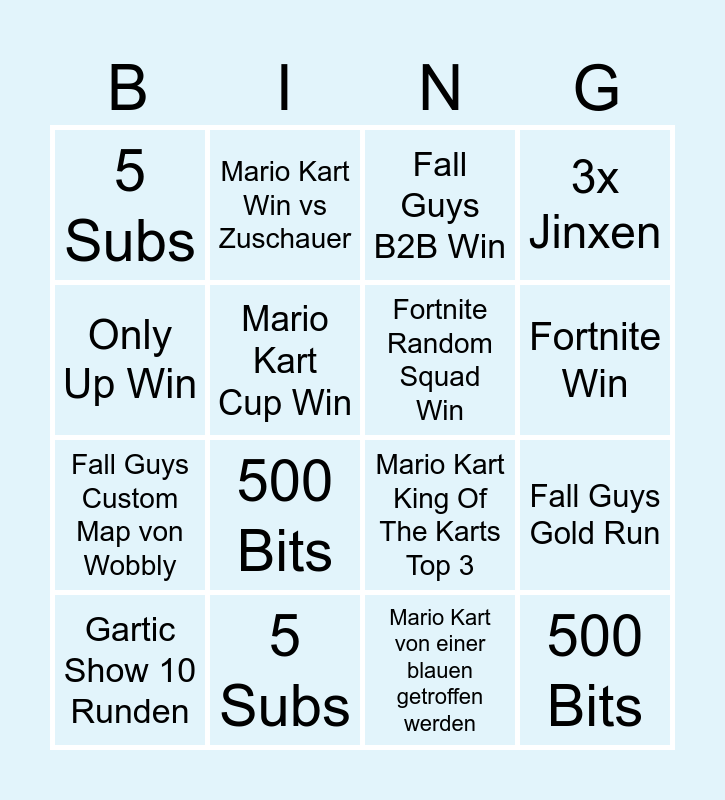 This bingo card has 16 words: 5 Subs, Fall Guys Gold Run, Fall Guys B2B Win, 5 Subs, Fall Guys Custom Map von Wobbly, Mario Kart Win vs Zuschauer, Mario Kart King Of The Karts Top 3, Mario Kart von einer blauen getroffen werden, Only Up Win, Mario Kart Cup Win, Gartic Show 10 Runden, 3x Jinxen, 500 Bits, Fortnite Win, Fortnite Random Squad Win and 500 Bits.