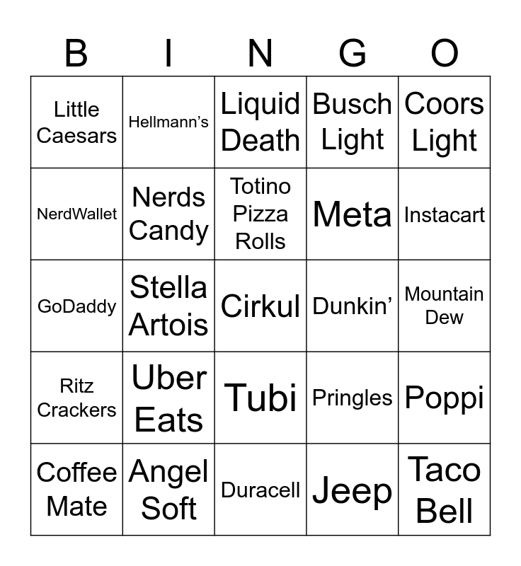 This bingo card has 36 words: Free!, Doritos, Häagen-Dazs, Nerds Candy, Pringles, Ritz Crackers, Totino Pizza Rolls, Bud Light, Coors Light, Michelob Ultra, Stella Artois, Busch Light, Door Dash, Dunkin’, Instacart, Little Caesars, Taco Bell, Uber Eats, Cirkul, Liquid Death, Mountain Dew, Poppi, Angel Soft, Coffee Mate, Duracell, Hellmann’s, GoDaddy, FanDuel, Meta, NerdWallet, TurboTax, Ram, Jeep, Tubi, Disney and Dove.