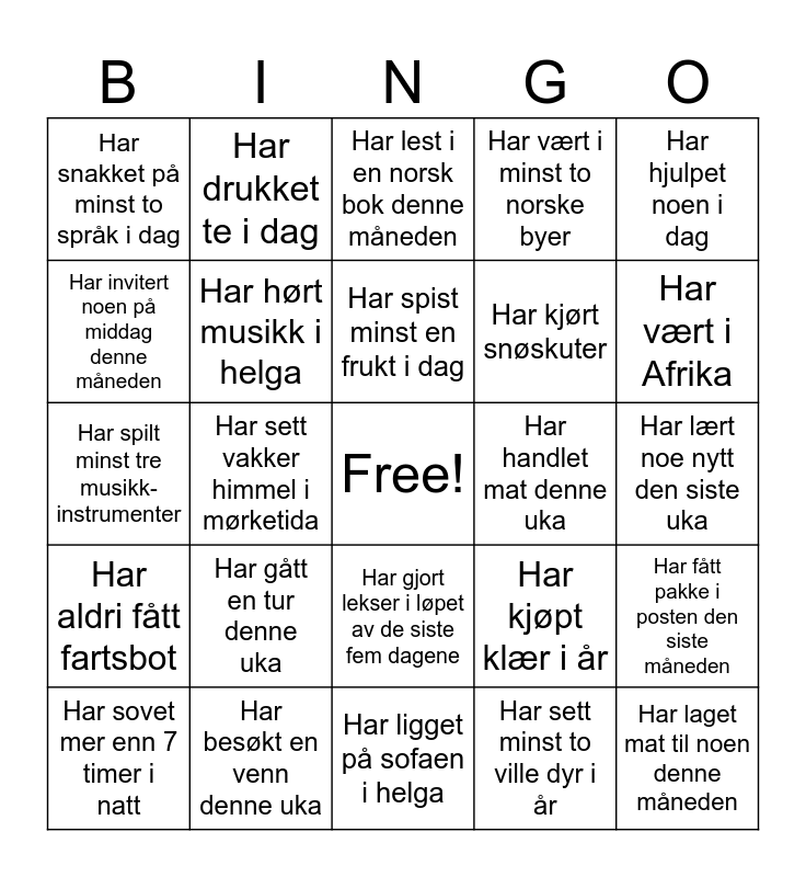 This bingo card has a free space and 24 words: Har gått en tur denne uka, Har besøkt en venn denne uka, Har spist minst en frukt i dag, Har sovet mer enn 7 timer i natt, Har hjulpet noen i dag, Har snakket på minst to språk i dag, Har invitert noen på middag denne måneden, Har drukket te i dag, Har handlet mat denne uka, Har gjort lekser i løpet av de siste fem dagene, Har kjørt snøskuter, Har spilt minst tre musikk-instrumenter, Har kjøpt klær i år, Har fått pakke i posten den siste måneden, Har hørt musikk i helga, Har sett minst to ville dyr i år, Har lært noe nytt den siste uka, Har lest i en norsk bok denne måneden, Har vært i Afrika, Har sett vakker himmel i mørketida, Har laget mat til noen denne måneden, Har aldri fått fartsbot, Har vært i minst to norske byer and Har ligget på sofaen i helga.