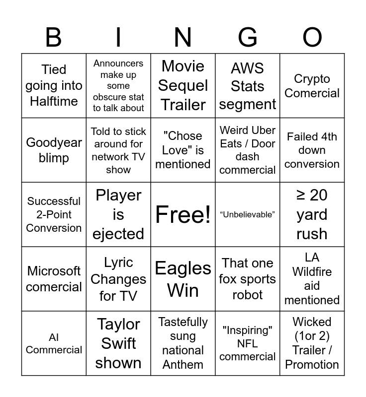 This bingo card has a free space and 44 words: Chiefs Win, Wicked (1or 2) Trailer / Promotion, "Phenomenal Preformance", AI Commercial, Doritos Comercial, "Inspiring" NFL commercial, Movie Sequel Trailer, Player Kneels, Crypto Comercial, Taylor Swift shown, AWS Stats segment, “Unbelievable”, Eagles Win, Lyric Changes for TV, "Not like us" Preformed, Tastefully sung national Anthem, "...This historic night...", Successful 2-Point Conversion, Jesus Commercial, Failed 4th down conversion, Announcers make up some obscure stat to talk about, Talks about Legacy, Violence in New Orleans mentioned, Tied going into Halftime, ≥ 30 yard throw, ≥ 20 yard rush, Sum of points <30, Game goes into Overtime, That one fox sports robot, Microsoft comercial, "Using AI to help...", LA Wildfire aid mentioned, Random celebrities shown at the game, Donald Trump shown/talked about, Player is ejected, Coaches Challenge Fails, Coaches Challenge successful, "A Bar Song" played during broadcast, "Chose Love" is mentioned, Goodyear blimp, Weird Uber Eats / Door dash commercial, Pick 6, Told to stick around for network TV show and Safety Scored.