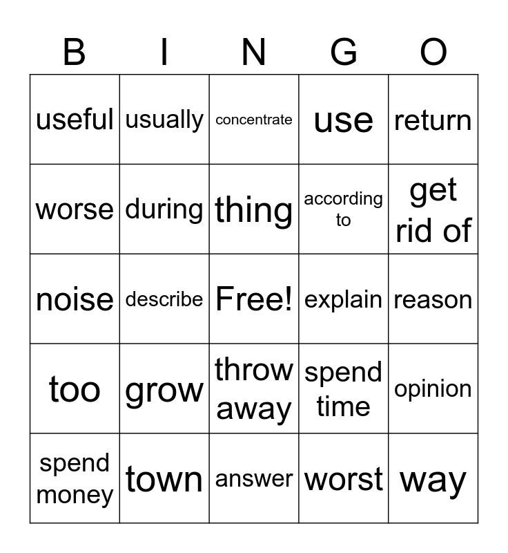 This bingo card has a free space and 24 words: grow, town, thing, spend money, return, useful, worse, usually, explain, throw away, according to, noise, spend time, opinion, during, worst, reason, concentrate, get rid of, describe, way, too, use and answer.