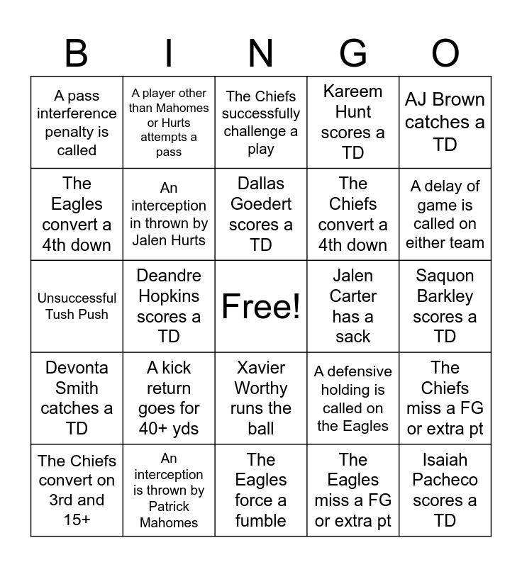 This bingo card has a free space and 40 words: Successful Tush Push, Unsuccessful Tush Push, A fumble is recovered by the defense, An interception in thrown by Jalen Hurts, An interception is thrown by Patrick Mahomes, Xavier Worthy runs the ball, Dallas Goedert scores a TD, Saquon Barkley has a run of 40+, AJ Brown catches a TD, Devonta Smith catches a TD, Deandre Hopkins scores a TD, Kareem Hunt scores a TD, Isaiah Pacheco scores a TD, Saquon Barkley scores a TD, Jalen Carter has a sack, A kick return goes for 40+ yds, A roughing the passer penalty is called, A pass interference penalty is called, The Eagles successfully challenge a play, The Chiefs successfully challenge a play, The Chiefs miss a FG or extra pt, The Eagles miss a FG or extra pt, The Chiefs convert a 4th down, The Eagles convert a 4th down, A kicker makes a FG of 50+ yds, A team scores a safety, Travis Kelce scores a TD, Taylor Swift is shown in the crowd, A TD of 50+ yds is scored, A TD of 1> yd is scored, The Eagles convert on 3rd and 15+, The Chiefs convert on 3rd and 15+, A defensive holding is called on the Chiefs, A defensive holding is called on the Eagles, A delay of game is called on either team, The Eagles force a fumble, The Chiefs force a fumble, A team attempts a 4th down of 5+ yards, A player other than Mahomes or Hurts attempts a pass and A player leaves the field on a cart.