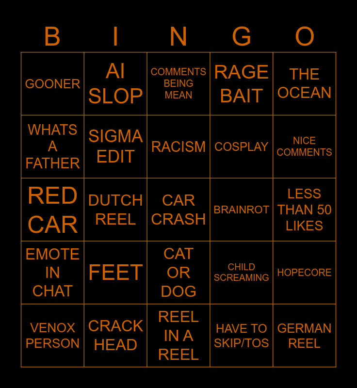 This bingo card has a free space and 24 words: FEET, CRACK HEAD, RACISM, VENOX PERSON, THE OCEAN, GOONER, WHATS A FATHER, AI SLOP, BRAINROT, CAT OR DOG, COSPLAY, RED CAR, CHILD SCREAMING, HOPECORE, SIGMA EDIT, HAVE TO SKIP/TOS, LESS THAN 50 LIKES, COMMENTS BEING MEAN, NICE COMMENTS, DUTCH REEL, GERMAN REEL, EMOTE IN CHAT, RAGE BAIT and REEL IN A REEL.
