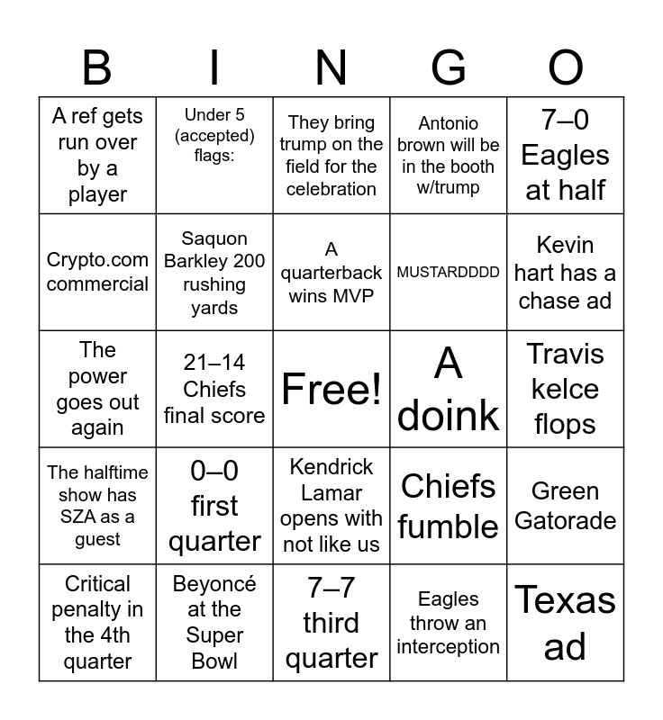 This bingo card has a free space and 24 words: 0–0 first quarter, Beyoncé at the Super Bowl, A quarterback wins MVP, Critical penalty in the 4th quarter, 7–0 Eagles at half, A ref gets run over by a player, Crypto.com commercial, Under 5 (accepted) flags:, A doink, Kendrick Lamar opens with not like us, MUSTARDDDD, The power goes out again, Chiefs fumble, Green Gatorade, Saquon Barkley 200 rushing yards, Eagles throw an interception, Travis kelce flops, They bring trump on the field for the celebration, Kevin hart has a chase ad, 21–14 Chiefs final score, Texas ad, The halftime show has SZA as a guest, Antonio brown will be in the booth w/trump and 7–7 third quarter.