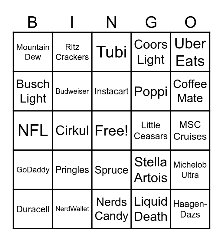 This bingo card has a free space and 49 words: Doritos, Haagen-Dazs, Lay's, Nerds Candy, Pringles, Reese's, Ritz Crackers, Totino Pizza Rolls, Busch Light, Bud Light, Budweiser, Coors Light, Michelob Ultra, Stella Artois, Door Dash, Dunkin', Instacart, Little Ceasars, Taco Bell, Uber Eats, Cirkul, Liquid Death, Mountain Dew, Poppi, Angel Soft, Coffee Mate, Duracell, Hellmann's, Spruce, GoDaddy, FanDuel, Meta, Squarespace, Homes.com, NerdWallet, Rocket Mortgage, TurboTax, Booking.com, MSC Cruises, Hims & Hers, Novartis, Jeep, Ram, Disney, NFL, Tubi, Dove, Bosch and Hexclad.