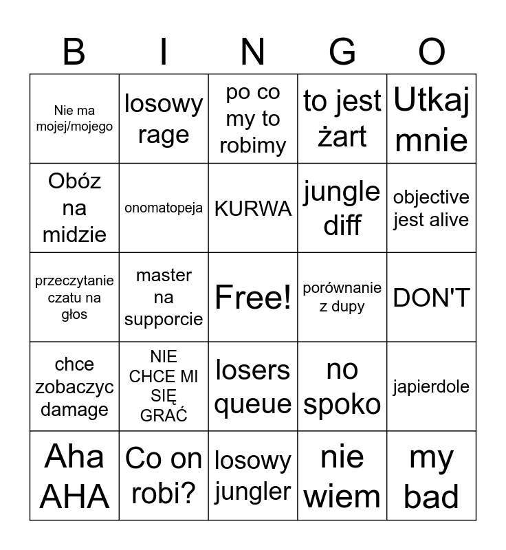 This bingo card has a free space and 24 words: NIE CHCE MI SIĘ GRAĆ, Co on robi?, KURWA, Aha AHA, Utkaj mnie, Nie ma mojej/mojego, Obóz na midzie, losowy rage, porównanie z dupy, losers queue, jungle diff, przeczytanie czatu na głos, no spoko, japierdole, onomatopeja, nie wiem, DON'T, po co my to robimy, objective jest alive, master na supporcie, my bad, chce zobaczyc damage, to jest żart and losowy jungler.