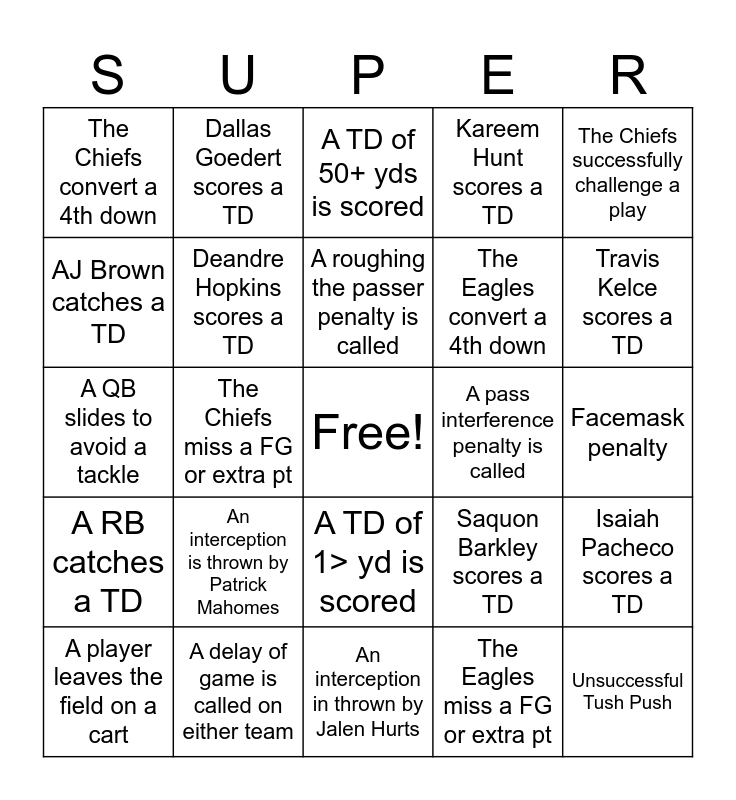 This bingo card has a free space and 50 words: Successful Tush Push, Unsuccessful Tush Push, A fumble is recovered by the defense, An interception in thrown by Jalen Hurts, An interception is thrown by Patrick Mahomes, Xavier Worthy runs the ball, Dallas Goedert scores a TD, Saquon Barkley has a run of 40+, AJ Brown catches a TD, Devonta Smith catches a TD, Deandre Hopkins scores a TD, Kareem Hunt scores a TD, Isaiah Pacheco scores a TD, Saquon Barkley scores a TD, Jalen Carter has a sack, A kick return goes for 40+ yds, A roughing the passer penalty is called, A pass interference penalty is called, The Eagles successfully challenge a play, The Chiefs successfully challenge a play, The Chiefs miss a FG or extra pt, The Eagles miss a FG or extra pt, The Chiefs convert a 4th down, The Eagles convert a 4th down, A kicker makes a FG of 50+ yds, A team scores a safety, Travis Kelce scores a TD, Taylor Swift is shown in the crowd, A TD of 50+ yds is scored, A TD of 1> yd is scored, The Eagles convert on 3rd and 15+, The Chiefs convert on 3rd and 15+, A defensive holding is called on the Chiefs, A defensive holding is called on the Eagles, A delay of game is called on either team, Rush for a 1st down, Pass for a 1st down, Offsides on the defense, Holding on the offense, Facemask penalty, The Eagles force a fumble, The Chiefs force a fumble, A team attempts a 4th down of 5+ yards, A player other than Mahomes or Hurts attempts a pass, A player leaves the field on a cart, A QB slides to avoid a tackle, A QB spikes the ball to stop the clock, A QB takes a knee to run out the clock, A RB catches a TD and The booth overturns a play.