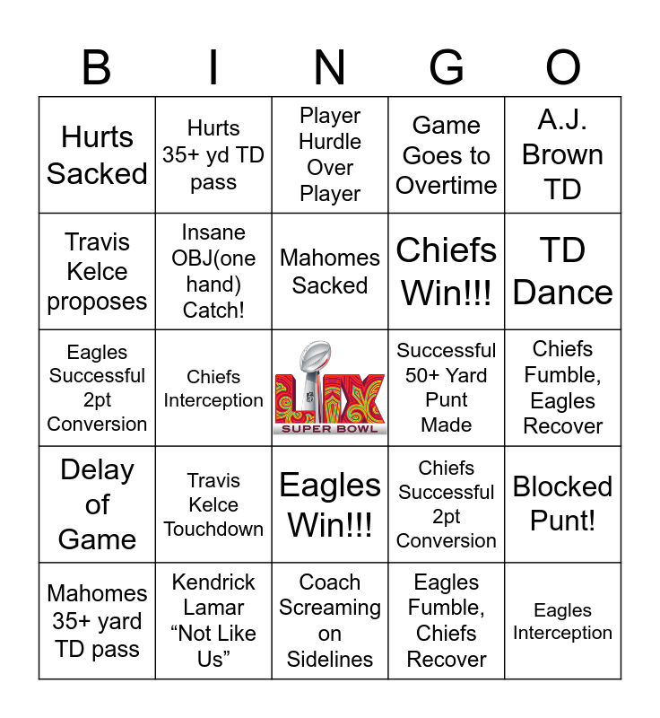This bingo card has a free space and 24 words: Travis Kelce Touchdown, Kendrick Lamar “Not Like Us”, Mahomes Sacked, Mahomes 35+ yard TD pass, A.J. Brown TD, Hurts Sacked, Travis Kelce proposes, Hurts 35+ yd TD pass, Successful 50+ Yard Punt Made, Eagles Win!!!, Chiefs Win!!!, Eagles Successful 2pt Conversion, Chiefs Successful 2pt Conversion, Blocked Punt!, Insane OBJ(one hand) Catch!, Eagles Fumble, Chiefs Recover, Chiefs Fumble, Eagles Recover, Player Hurdle Over Player, TD Dance, Chiefs Interception, Eagles Interception, Delay of Game, Game Goes to Overtime and Coach Screaming on Sidelines.