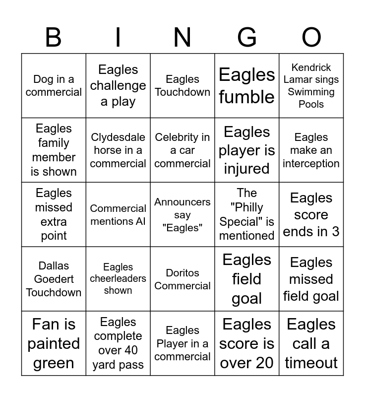 This bingo card has a free space and 27 words: Eagles field goal, Jalen Hurts gets sacked, Eagles player is injured, Eagles Player in a commercial, Eagles family member is shown, Eagles Touchdown, Eagles challenge a play, Dallas Goedert Touchdown, The "Philly Special" is mentioned, Eagles missed field goal, Eagles missed extra point, Eagles fumble, Fan is painted green, Eagles complete over 40 yard pass, Eagles make an interception, Eagles player cries, Clydesdale horse in a commercial, Celebrity in a car commercial, Eagles cheerleaders shown, Dog in a commercial, Eagles score ends in 3, Eagles score is over 20, Commercial mentions AI, Eagles call a timeout, Doritos Commercial, Kendrick Lamar sings Swimming Pools and Kendrick Lamar brings out a guest.