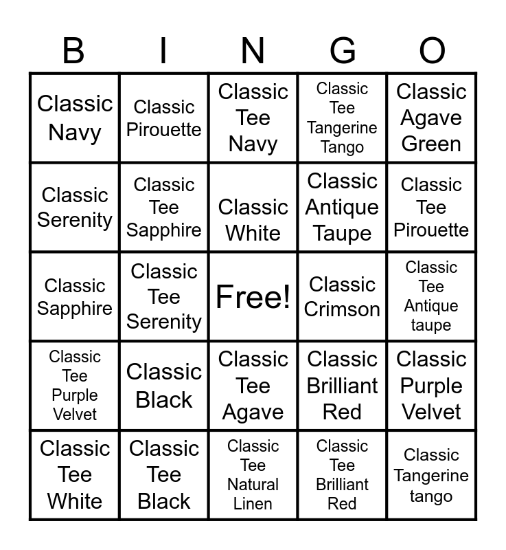 This bingo card has a free space and 24 words: Classic Black, Classic Tee Black, Classic White, Classic Tee White, Classic Agave Green, Classic Navy, Classic Serenity, Classic Pirouette, Classic Crimson, Classic Tee Agave, Classic Antique Taupe, Classic Sapphire, Classic Brilliant Red, Classic Purple Velvet, Classic Tee Sapphire, Classic Tee Brilliant Red, Classic Tee Antique taupe, Classic Tee Navy, Classic Tee Pirouette, Classic Tee Serenity, Classic Tangerine tango, Classic Tee Purple Velvet, Classic Tee Tangerine Tango and Classic Tee Natural Linen.