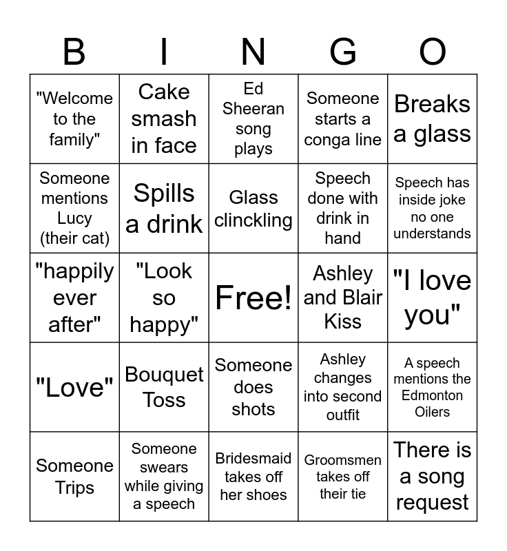 This bingo card has a free space and 33 words: Someone Cries, "Part of the Family", "Look so happy", "Raise a/this glass", "Love", Spills a drink, Breaks a glass, Someone Trips, Cake smash in face, Speech read out from a phone, Glass clinckling, Ed Sheeran song plays, Technical Difficulties, "Beautiful", Ashley and Blair Kiss, Speech has inside joke no one understands, Someone swears while giving a speech, "happily ever after", Bouquet Toss, Ashley changes into second outfit, Someone does shots, Something goes wrong, "Welcome to the family", "I love you", Bridesmaid takes off her shoes, There is a song request, Someone starts a conga line, Speech done with drink in hand, Someone mentions Lucy (their cat), A speech mentions the Edmonton Oilers, Bridesmaid takes off her shoes, Groomsmen takes off their tie and "give if up for..." (the bride and groom, etc.).
