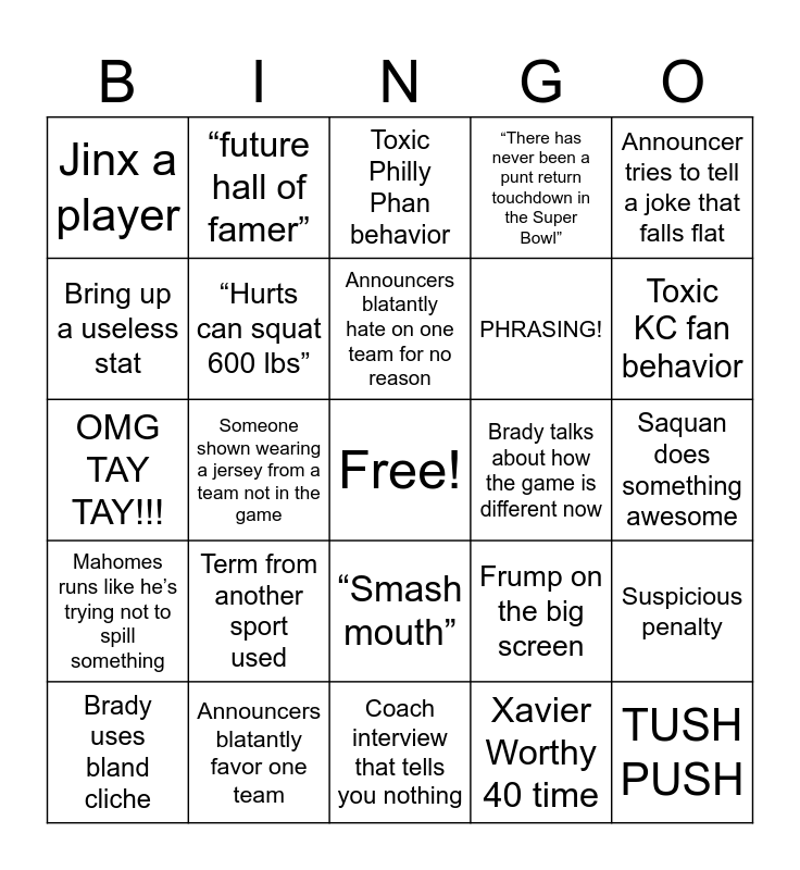 This bingo card has a free space and 24 words: Term from another sport used, Announcers blatantly favor one team, Announcers blatantly hate on one team for no reason, Brady uses bland cliche, Announcer tries to tell a joke that falls flat, Jinx a player, Bring up a useless stat, “future hall of famer”, Brady talks about how the game is different now, “Smash mouth”, PHRASING!, OMG TAY TAY!!!, Frump on the big screen, Suspicious penalty, “Hurts can squat 600 lbs”, Xavier Worthy 40 time, Saquan does something awesome, Toxic Philly Phan behavior, Toxic KC fan behavior, Someone shown wearing a jersey from a team not in the game, TUSH PUSH, Mahomes runs like he’s trying not to spill something, “There has never been a punt return touchdown in the Super Bowl” and Coach interview that tells you nothing.