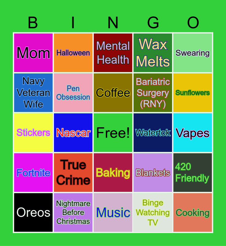 This bingo card has a free space and 24 words: True Crime, Nightmare Before Christmas, Coffee, Oreos, Swearing, Mom, Navy Veteran Wife, Halloween, Watertok, Baking, Bariatric Surgery (RNY), Stickers, Blankets, 420 Friendly, Pen Obsession, Binge Watching TV, Vapes, Mental Health, Sunflowers, Nascar, Cooking, Fortnite, Wax Melts and Music.